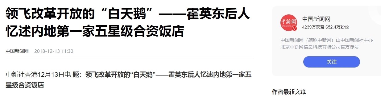2、中国新闻网 《领飞改革开放的“白天鹅”——霍英东后人忆述内地第一家五星级合资饭店》
